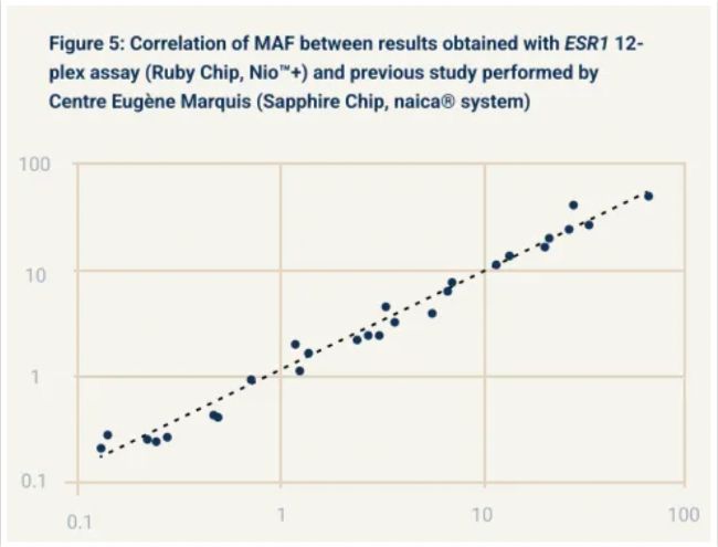 法國Eugène Marquis中心在Ruby芯片和NioTM+全自動數(shù)字PCR一體機系統(tǒng)平臺上,驗證了ESR1 12-plex在乳腺癌患者血漿和 FFPE樣本的檢測靈敏度和定量能力,與之前檢測結果高度相關,同時兼具特異性和準確性。