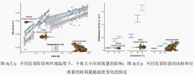 在最近的研究中,Pablo Padilla帶領(lǐng)的團(tuán)隊(duì)研究了全球變暖對具有復(fù)雜生命周期的兩棲動物如池蛙(Pelophylax ridibundus)的入侵潛力的影響,通過測量蝌蚪、變態(tài)高峰期和變態(tài)后階段在13℃、23℃和30℃三個環(huán)境溫度下的休息時耗氧量,來量化其標(biāo)準(zhǔn)代謝率的變化。