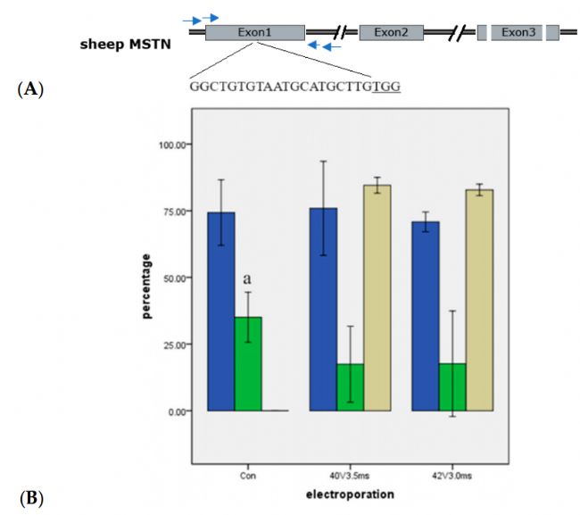 圖1.針對綿羊ACTG1基因的靶向后,分裂和囊胚率(均值±標準差)。不同字母表示顯著差異(p<0.05)。藍色條表示IVF后的受精卵分裂率。綠色條表示囊胚形成率。