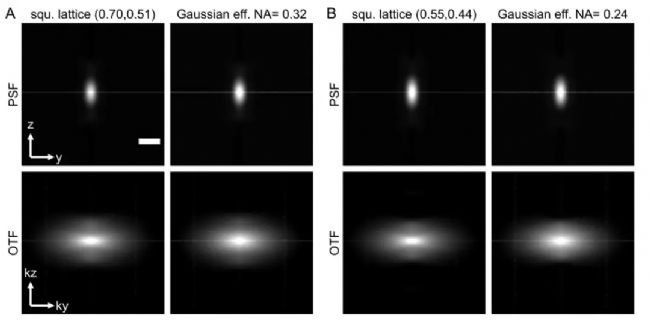 圖3. 方形光柵和高斯光片顯微鏡的點(diǎn)擴(kuò)散函數(shù)(PSF)和光學(xué)傳遞函數(shù)(OTF)。所有PSF和OTF圖像均應(yīng)用了0.8的伽馬校正,以增加弱特征的對(duì)比度。選擇具有類似共焦參數(shù)的高斯光片以與光柵光片進(jìn)行比較。PSF的比例尺為1 μm。
