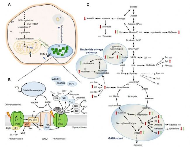 圖注:葉綠體Asc控制植物的新陳代謝。A) Asc的生物合成在細胞質(zhì)中進行,最后一步在線粒體中進行,vtc2編碼GDP-L半乳糖磷酸化酶(GGP),催化Asc生物合成的第一步。PHT4;4將Asc轉(zhuǎn)運到葉綠體中。B)可能與葉綠體Asc相互作用的光合電子傳遞元件和基質(zhì)酶(根據(jù)本研究中的PISA分析,用藍色表示)。C)葉綠體和細胞Asc缺乏會導(dǎo)致代謝組發(fā)生廣泛變化,包括誘導(dǎo)GABA分流和核苷酸補救合成途徑。深紅色和淺綠色箭頭分別表示vtc2-4突變體和pht4;4-3突變體與WT(Col-0)相比,相應(yīng)代謝物發(fā)生了顯著變化;疑珬l表示已鑒定出特定代謝物,但未檢測到相對于WT的顯著變化。