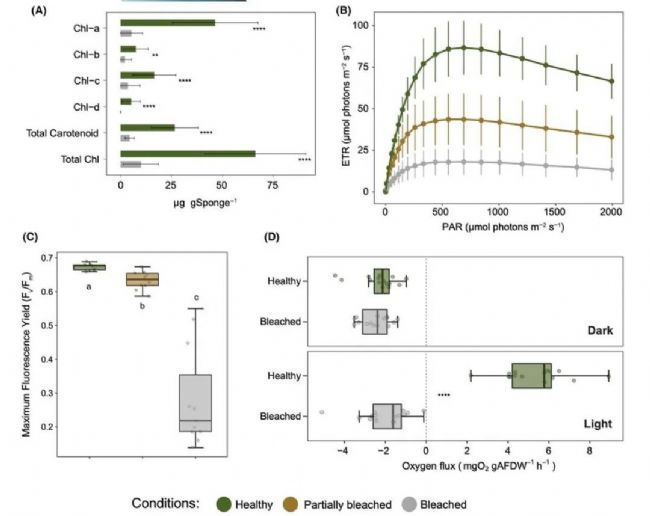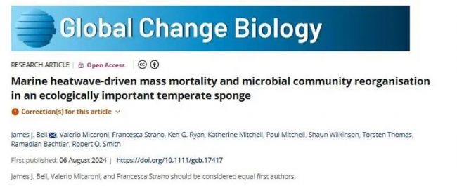 2. Marine heatwave-driven mass mortality and microbial community reorganisation in an ecologically important temperate sponge (Global Change Biology, IF=10.8)隨著全球氣候的不斷變化,海洋熱浪(MHWs)的頻率、持續(xù)時間和強度都在增加,破壞了全球海洋生態(tài)系統(tǒng)。雖然報告的大多數(shù)影響都發(fā)生在熱帶地區(qū),但新西蘭卻在2022年經(jīng)歷了強度最大、持續(xù)時間最長的海洋熱浪,對海洋海綿造成了嚴重影響。海綿對巖石底棲海洋生物群落至關(guān)重要,其數(shù)量影響著生態(tài)系統(tǒng)的功能。2024年8月6日,Global Change Biology在線發(fā)表新西蘭維多利亞大學(xué)生物科學(xué)學(xué)院James J. Bell等人標題為Marine heatwave-driven mass mortality and microbial community reorganisation in an ecologically important temperate sponge的研究論文。文章探討了2022年那次MHW對新西蘭峽灣地區(qū)光合作用海綿(Cymbastella lamellata)的影響。
