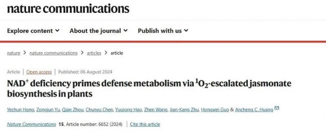 煙酰胺腺嘌呤二核苷酸(NAD+)是一種氧化還原輔助因子,是細胞代謝的中心信號。破壞植物體內(nèi)NAD的平衡會改變植物的生長和抗逆性,但其潛在機制仍不清楚。2024年8月6日,南方科技大學(xué)黃安誠團隊在Nature Communications 在線發(fā)表題為“NAD+ deficiency primes defense metabolism via 1O2-escalated jasmonate biosynthesis in plants”的研究論文,該研究概述了植物中NAD+缺陷介導(dǎo)的JA誘導(dǎo)和防御啟動序列,表明這種防御機制在植物的脅迫響應(yīng)中起作用。