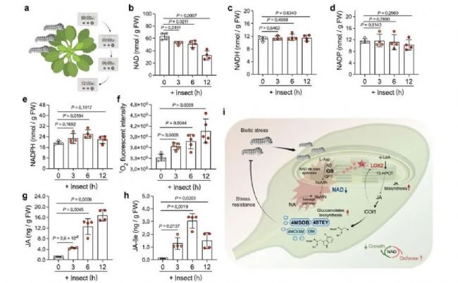 圖注:蟲害導(dǎo)致的NAD失調(diào)激活了茉莉酸鹽的生物合成,從而啟動植物防御功能