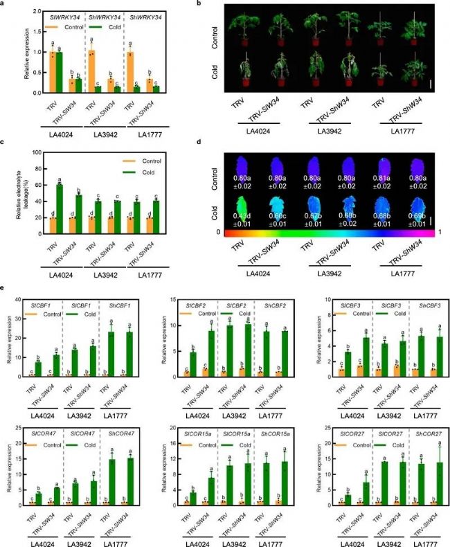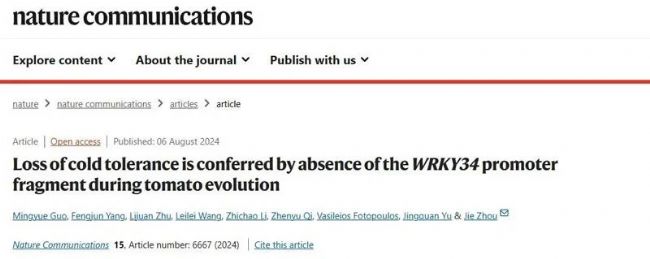 研究人員在煙草系統(tǒng)和野生型擬南芥蟲咬應(yīng)答條件下復(fù)現(xiàn)了NAD+含量降低激活單線態(tài)氧和茉莉酸合成的信號轉(zhuǎn)導(dǎo)通路,表明此信號轉(zhuǎn)導(dǎo)通路能夠在植物調(diào)節(jié)自身代謝以平衡生長與抗性中起重要作用。因此,本項研究首次揭示了“NAD+穩(wěn)態(tài)->單線態(tài)氧激活->茉莉酸合成轉(zhuǎn)導(dǎo)->次級代謝產(chǎn)物(芥子油苷)合成”的完整應(yīng)答通路介導(dǎo)植物抗(蟲)性防御反應(yīng)的分子機制,從而提出了NAD+穩(wěn)態(tài)是平衡植物生長與抗(蟲)性的關(guān)鍵“代謝監(jiān)測點”(metabolic checkpoint)的分子模型(圖1),為深入了解植物—環(huán)境互作的信號轉(zhuǎn)導(dǎo)機制與代謝基礎(chǔ)提供了新見解,也為植物抗性改造和育種增添了理論基礎(chǔ)。番茄是全球重要的蔬菜作物,起源于南美洲安第斯山脈地區(qū)。在番茄的進化和人類選擇過程中,由于生長環(huán)境的改變(從高海拔到低海拔),使得低溫不再是番茄進化選擇的主要逆境壓力,這造成了現(xiàn)代栽培番茄耐寒能力下降。然而,隨著我國設(shè)施農(nóng)業(yè)的快速發(fā)展,冬春低溫造成的設(shè)施蔬菜冷害業(yè)已成為限制產(chǎn)業(yè)高質(zhì)量發(fā)展的瓶頸問題。因此,解析設(shè)施主栽喜溫蔬菜番茄耐寒能力下降的機制,創(chuàng)制耐寒種質(zhì)和調(diào)控技術(shù),對于產(chǎn)業(yè)發(fā)展具有重要意義。2024年8月6日,浙江大學(xué)喻景權(quán)院士周杰教授團隊在Nature Communications在線發(fā)表了題為“Loss of cold tolerance is conferred by absence of the WRKY34 promoter fragment during tomato evolution”的研究論文。該研究以冷敏感的栽培番茄 (Solanum lycopersicum)和耐寒的野生多毛番茄(Solanum habrochaites)為對象,通過多組學(xué)聯(lián)合分析以及生理生化、遺傳學(xué)和生物信息學(xué)等手段,揭示了在野生番茄和栽培番茄中WRKY34低溫表達模式差異的原因,及其調(diào)控番茄耐寒能力的具體機制。