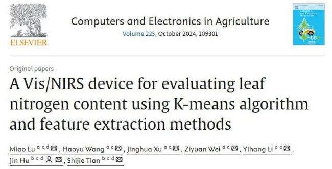 準確評估葉氮含量(LNC)對實際生產(chǎn)和肥料管理至關(guān)重要。2024年8月7日,西北農(nóng)林科技大學(xué)信息工程學(xué)院胡瑾教授課題組在Computers and Electronics in Agriculture發(fā)表題為A Vis/NIRS device for evaluating leaf nitrogen content using K-means algorithm and feature extraction methods的研究論文。在這項研究中,盧苗等人設(shè)計了一種便攜式設(shè)備,用于快速、無損地精確評估葉氮含量。