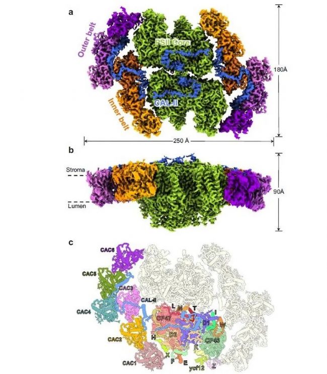 放氧光合作用是自然界中重要的生命過程,可以將光能轉(zhuǎn)化為化學(xué)能,合成有機物的同時釋放氧氣,為地球上絕大多數(shù)生命提供物質(zhì)和能量。位于類囊體膜上的光系統(tǒng)I(photosystem I, PSI)和光系統(tǒng)II (photosystem II, PSII)對于光合作用光反應(yīng)至關(guān)重要,兩個光系統(tǒng)均由核心和外周捕光天線構(gòu)成,其中光系統(tǒng)核心是高度保守的,但結(jié)合在核心外周的捕光天線在不同物種間存在著巨大差異,這些差異反映了不同光合生物對特定生存環(huán)境的適應(yīng),也體現(xiàn)了自然界中多樣的光合調(diào)節(jié)機制。隱藻是由紅藻經(jīng)次級內(nèi)共生過程演化出的一類單細胞真核微藻,具有極其獨特的捕光天線,包括位于類囊體膜內(nèi)的葉綠素 a/c 結(jié)合蛋白(chlorophyll a/c proteins,CAC)和結(jié)合在類囊體膜外腔側(cè)的藻膽蛋白(phycobiliprotein,PBP)。由于缺少隱藻光系統(tǒng)的結(jié)構(gòu)信息,其核心與捕光天線的組裝方式及其捕光調(diào)節(jié)機制尚不清楚,解析隱藻光系統(tǒng)-捕光天線復(fù)合物的高分辨率結(jié)構(gòu)不僅為揭示這類光合生物的光合調(diào)節(jié)機制提供結(jié)構(gòu)基礎(chǔ),而且能夠為提高植物的光能利用效率、增加作物產(chǎn)量等提供新思路。