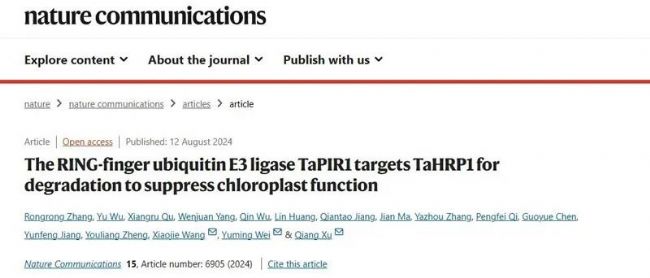 植物葉綠體在光合作用和免疫中起關(guān)鍵作用,但小麥中控制葉綠體相關(guān)核基因表達的精確及時的轉(zhuǎn)錄調(diào)節(jié)機制在很大程度上仍未知。泛素化是一種重要的翻譯后調(diào)節(jié)過程,E3泛素連接酶在植物的激素反應(yīng)、發(fā)育和免疫等多種細胞過程中起作用,但泛素連接酶E3在小麥免疫中的作用及其底物識別模式尚不清楚。2024年8月12日,Nature Communications在線發(fā)表了四川農(nóng)業(yè)大學(xué)魏育明/許強教授團隊聯(lián)合西北農(nóng)林科技大學(xué)王曉杰教授團隊題為The RING-finger ubiquitin E3 ligase TaPIR1 targets TaHRP1 for degradation to suppress chloroplast function的研究論文。本研究揭示了小麥中RING型泛素E3連接酶TaPIR1通過泛素化并降解轉(zhuǎn)錄因子TaHRP1來抑制葉綠體功能,從而增加植物對條銹病(Pst)的敏感性。