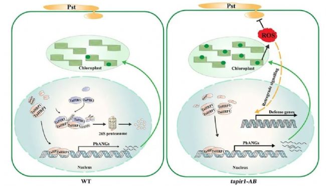 TaPIR1是小麥抗Pst的負調(diào)控因子,TaPIR1在Pst感染的小麥葉片中表達上調(diào),其敲除可增強小麥對Pst的抗性,過表達則降低抗性。TaPIR1與TaHRP1在細胞核中相互作用并使其泛素化,TaPIR1是一種功能性E3 Ub連接酶,能泛素化TaHRP1。TaPIR1可促進TaHRP1在體外和體內(nèi)的降解,TaHRP1的賴氨酸殘基K131和K136 是TaPIR1泛素化的位點,其突變會影響TaHRP1的穩(wěn)定性和降解。TaHRP1是小麥抗Pst的正調(diào)控因子,TaHRP1的缺失會降低小麥對Pst的抗性,過表達則增強抗性,TaHRP1可直接結(jié)合PhANGs啟動子中的TaHRP1-結(jié)合位點元件并激活其轉(zhuǎn)錄,從而調(diào)節(jié)PhANGs的表達。TaHRP1有助于維持葉綠體衍生的ROS穩(wěn)態(tài),TaHRP1 過表達可促進光合作用和葉綠體衍生的ROS積累,TaPIR1則抑制TaHRP1誘導(dǎo)的ROS在葉綠體中的產(chǎn)生。