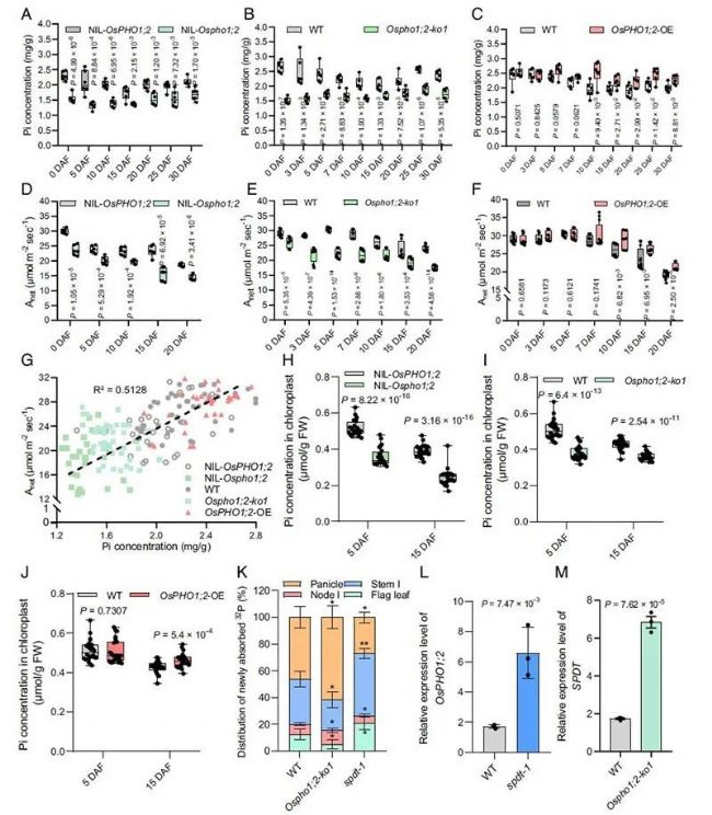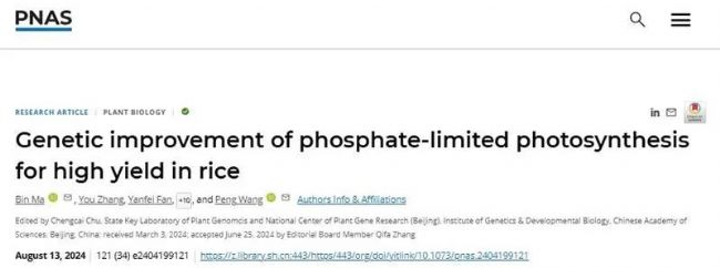 2024年8月13日, PNAS在線發(fā)表了中國科學(xué)院分子植物科學(xué)卓越創(chuàng)新中心王鵬課題組與何祖華課題組合作完成的題為Genetic improvement of phosphate-limited photosynthesis for high yield in rice的研究論文,發(fā)現(xiàn)水稻OsPHO1;2磷轉(zhuǎn)運蛋白能夠向葉片分配無機磷,其表達量與葉片Pi含量、凈光合速率以及產(chǎn)量的增高呈正相關(guān)。