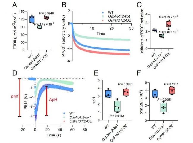 圖注:OsPHO1;2缺失會導(dǎo)致光合電子傳遞活性和跨類囊體膜質(zhì)子動力勢下降。