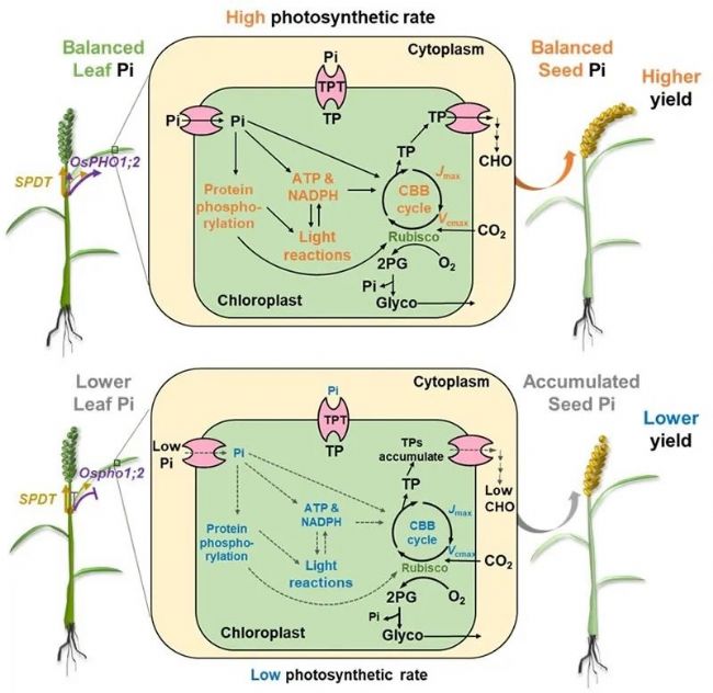 光合作用是作物改良的重要目標之一。光合葉片中的無機磷(Pi)作為ATP合成原料并參與光合蛋白調(diào)控以及磷酸丙糖(TP)等光合產(chǎn)物周轉(zhuǎn),葉片中其含量在一定條件下可能成為光合作用高效運轉(zhuǎn)的限制因素。實際上,田間光合作用的磷限制常發(fā)生在抽穗灌漿階段、需要光合作用高效運轉(zhuǎn)的時期。葉片(源)與種子(庫)之間的Pi分配對作物籽粒灌漿有重要影響,然而,Pi在源庫之間如何分配調(diào)控及其對葉片光合效率的影響尚需解析,有效的遺傳解決方案仍有待建立。