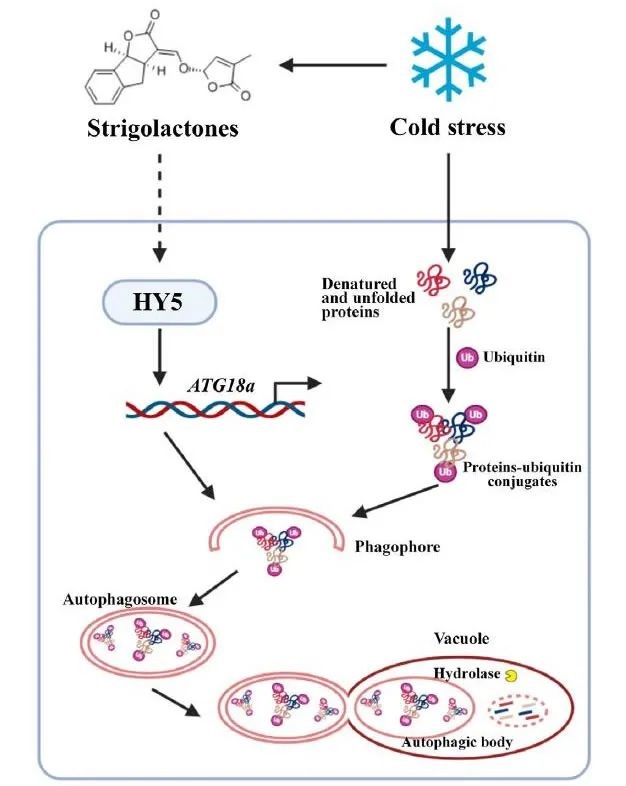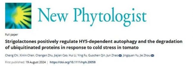 隨著全球氣候變暖,極端天氣增加,植物經(jīng)常會面臨各種各樣的脅迫,嚴重影響其生長發(fā)育。低溫是一種主要脅迫,限制了許多作物的品質(zhì)和產(chǎn)量。而番茄作為一種喜溫性蔬菜,低溫會導(dǎo)致其生長發(fā)育停滯,花期延遲,坐果率顯著降低。在整個進化過程中,植物已經(jīng)發(fā)展出多種抵御寒冷的機制,其中植物激素調(diào)節(jié)起著至關(guān)重要的作用。同時,自噬參與蛋白質(zhì)降解和氨基酸循環(huán),在植物發(fā)育和逆境反應(yīng)中起著關(guān)鍵作用。然而,自噬與植物激素之間的關(guān)系尚不清楚。2024年8月19日,New Phytologist在線發(fā)表浙江大學(xué)周杰教授和北京大學(xué)現(xiàn)代農(nóng)業(yè)研究院趙珺博士聯(lián)合署名標題為Strigolactones positively regulate HY5-dependent autophagy and the degradation of ubiquitinated proteins in response to cold stress in tomato的研究論文。