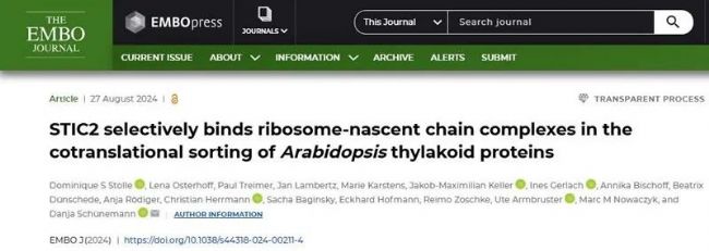 10. STIC2 selectively binds ribosome-nascent chain complexes in the cotranslational sorting of Arabidopsis thylakoid proteins (The EMBO Journal, IF=9.4)葉綠體編碼的多種跨類囊體膜蛋白質(zhì)對光合作用復(fù)合物至關(guān)重要,但人們對其生物發(fā)生的協(xié)調(diào)過程仍然知之甚少。2024年8月27日,The EMBO Journal在線發(fā)表德國魯爾大學(xué)Danja Schünemann課題組標題為STIC2 selectively binds ribosome-nascent chain complexes in the cotranslational sorting of Arabidopsis thylakoid proteins的研究論文。文章將STIC2 確定為一種新的核糖體相關(guān)因子,并提出STIC2與cpSRP54合作,將D1和潛在的其他葉綠體編碼的光合亞基共翻譯遞送至類囊體膜。