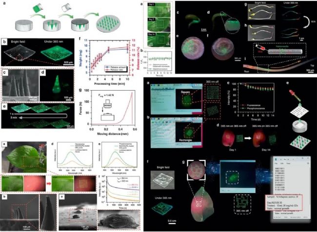 利用植物發(fā)光標簽構(gòu)建植物信息云平臺的示意圖在先前報道的工作中,將材料送入植物的常用方法包括葉面噴霧、根部吸收和樹干/葉柄注射。然而,這些方法在將微米級顆粒送入植物方面存在局限性。雖然樹干/葉柄注射方法可以通過機械損傷角質(zhì)層和表皮等屏障直接進入維管系統(tǒng),但其侵入性使其只適合某些大型木本植物。近年來,微針貼片因其最小的侵入性、安全性和效率,在藥物輸送應(yīng)用中被使用,呈現(xiàn)出一種有前景的替代方案。在先前的報告中,近紅外發(fā)光顆粒通過微針貼片注入皮膚,以記錄疫苗接種的長期信息。從醫(yī)療領(lǐng)域的微針貼片中汲取靈感,研究人員采用它們將長余輝材料送入植物葉片,實現(xiàn)信息記錄和編碼。為了構(gòu)建植物中的信息記錄平臺,首先將SAO與H3PO4封裝以增強耐水性,并在植物復(fù)雜的內(nèi)部環(huán)境中保持穩(wěn)定的發(fā)光。然后,將微針貼片的尖端裝載SAO@H3PO4,創(chuàng)建排列良好的發(fā)光陣列,為植物提供特定的編碼信息。這些信息的匯編旨在建立一個智能農(nóng)業(yè)平臺,其中植物發(fā)光標簽作為通往云平臺的門戶,用于存儲各種生理信息,并實現(xiàn)基于物聯(lián)網(wǎng)的精準農(nóng)業(yè)系統(tǒng)。