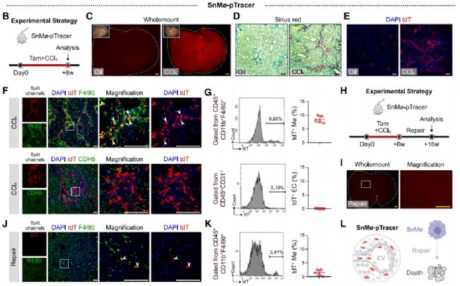 研究團(tuán)隊(duì)將巨噬細(xì)胞特異性F4/80-Dre或內(nèi)皮細(xì)胞特異性Cdh5-DreER小鼠品系與p16-CreER和R26-RL-tdT小鼠交配,得到了F4/80-Dre; p16-CreER; R26-RL-tdT小鼠(SnMø-pTracer)及Cdh5-DreER; p16-CreER; R26-RL-tdT小鼠(SnEC-pTracer)。在CCl4誘導(dǎo)的肝損傷中,SnMø-pTracer和SnEC-pTracer系統(tǒng)分別精確標(biāo)記了p16Ink4a+巨噬細(xì)胞和p16Ink4a+內(nèi)皮細(xì)胞。