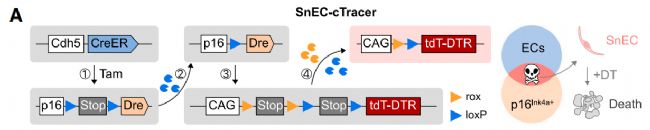 為克服這些限制,研究團(tuán)隊(duì)開(kāi)發(fā)了一種新的遺傳系統(tǒng),命名為Sn-cTracer(senescent cells-Cre-induced-tracer)。Sn-cTracer 涉及三種小鼠品系:細(xì)胞類(lèi)型特異性Cre(ER)工具小鼠、p16-LSL-Dre(p16-loxP-Stop-loxP-Dre)和R26-RL-tdT-DTR(Rosa26-rox-Stop-roxP-Stop-loxP-tdT-DTR)。Cre-loxP重組可切除p16-LSL-Dre的Stop序列,從而在Cre表達(dá)細(xì)胞中將p16-LSL-Dre轉(zhuǎn)化為p16-Dre,并且只有同時(shí)表達(dá)Dre和Cre的細(xì)胞才能移除R26-RL-tdT-DTR等位基因中的兩個(gè)Stop序列,從而永久表達(dá)tdT和DTR(白喉毒素受體),實(shí)現(xiàn)以細(xì)胞類(lèi)型特異性的方式對(duì)p16Ink4a+細(xì)胞進(jìn)行不間斷記錄和遺傳清除。