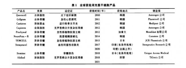 1995年,科學(xué)家Lazarus等展示間充質(zhì)干細(xì)胞在臨床移植治療中的安全性;2004年報(bào)道MSC有效治療移植物抗宿主患者;2010年,首個(gè)間充質(zhì)干細(xì)胞產(chǎn)品用于治療皮下組織缺損;2012年,首例異體臍帶血間充質(zhì)干細(xì)胞制劑,針對(duì)退行性關(guān)節(jié)炎Cartistem治療上市。目前,全球共批準(zhǔn)10種間充質(zhì)干細(xì)胞產(chǎn)品(表1),主要用于組織修復(fù)和免疫調(diào)節(jié)。