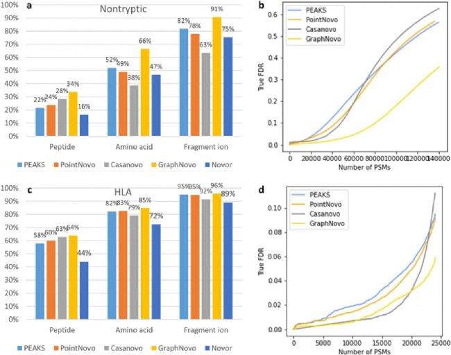 圖5丨對非酶切( a、b)和 HLA 數(shù)據(jù)集(c、d )的從頭測序結(jié)果的評估