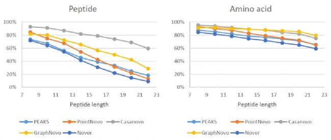 為了進一步研究多肽長度對從頭測序準確度的影響,我們重新評估了按多肽長度分布的 ABRF 數(shù)據(jù)集上的結(jié)果。如圖6所示,準確率隨著多肽長度的增加而降低。