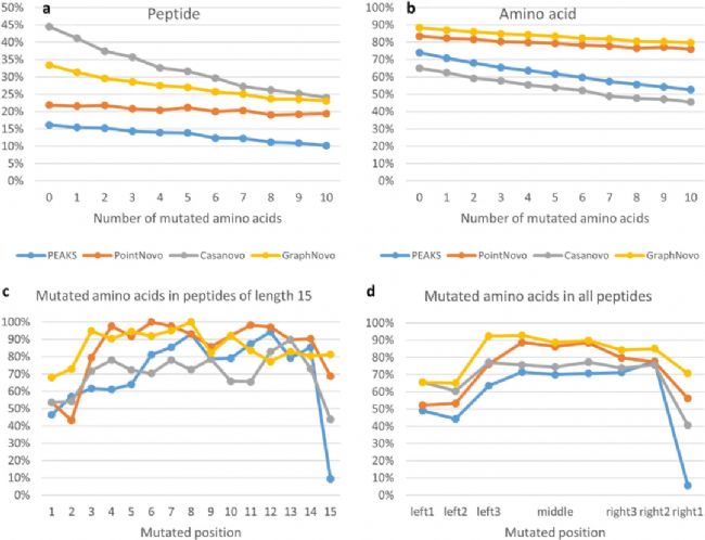 我們進一步分析了突變氨基酸在肽段中的位置對從頭測序結(jié)果的影響。如圖7c所示,當突變發(fā)生在肽段的前后三個氨基酸位置時,對準確度影響較大,這是因為N端和C端的碎片離子缺失導致的,GraphNovo能夠比其他算法更好地解決這個問題[2]。