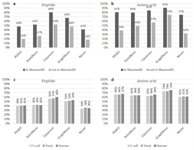 為此,我們在相同實驗條件下,重新采集了大腸桿菌、酵母和人類三個物種的質(zhì)譜數(shù)據(jù),搜庫結(jié)果得到30-34K張PSMs,打分和多肽長度分布均比較一致。在MassIVE-KB中發(fā)現(xiàn)了大約96%的人類PSM,而大腸桿菌和酵母PSMs僅0-2%。然后,我們比較了這三個數(shù)據(jù)集的從頭測序準確度,如圖8c-d所示,PEAKS®️、PointNovo和 Novor對單個數(shù)據(jù)集的準確度幾乎相同。而Casanovo和GraphNovo的結(jié)果顯示,與人類樣本相比,大腸桿菌和酵母的多肽準確率下降了3-4% ,表明深度學習算法存在一定的序列記憶和偏向性。