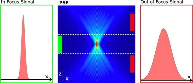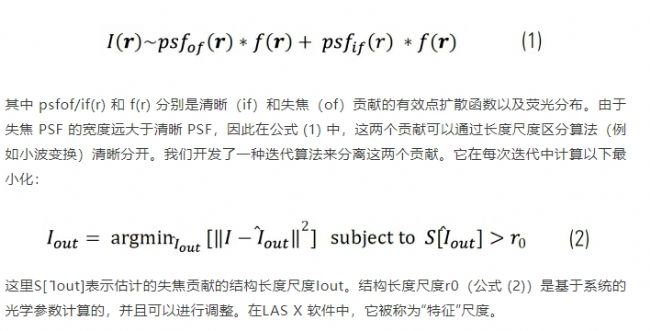 使用寬場顯微鏡獲取的圖像可以分解為兩個組成部分:清晰信號和背景信號。背景信號主要來自失焦信號。因此,寬場圖像 I(r) 可以近似表示為: