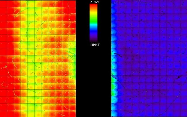 圖 5:兩個不重疊的瓷磚掃描的合并圖像(每個 187 個視場,250 x 250 微米)。左:在高且不均勻背景區(qū)域(區(qū)域 A)中的瓷磚掃描。右:在低背景區(qū)域(區(qū)域 B)中的瓷磚掃描。