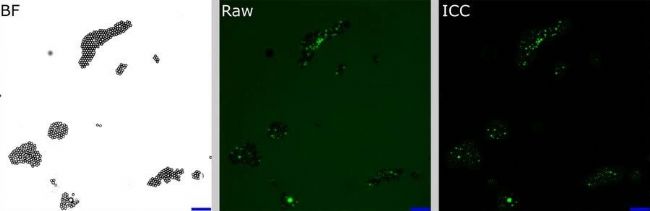 圖 6:BF 通道的單個視場(左),原始熒光圖像(中間)和 ICC 處理圖像(右側(cè))。BF 通道用于分割珠子的中央?yún)^(qū)域。分割區(qū)域用于熒光通道的分析。比例尺:20 微米。原始圖像:灰度值從 250,00 到 600,00 的縮放。ICC 圖像:灰度值從 0 到 26,000 的縮放。