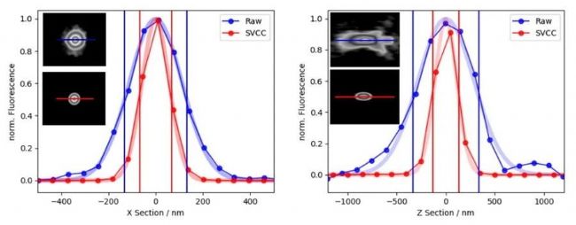 圖 12:單個珠子的 X 軸(左)和 Z 軸(右)強度測量,尺寸低于光學(xué)分辨率極限:SVCC 之前(藍點)和 SVCC 之后(紅點)以及擬合的高斯曲線(陰影)。插圖顯示了相應(yīng)的 XY 和平面。