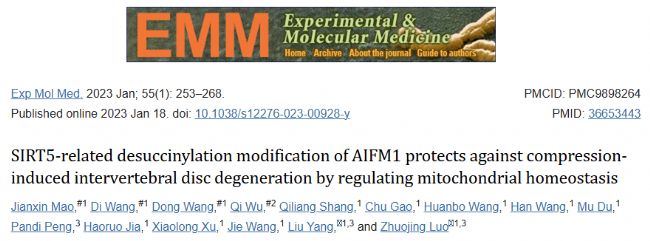鑒于此,空軍軍醫(yī)大學(xué)西京醫(yī)院骨科研究所、菏澤市立醫(yī)院重癥監(jiān)護科及西北工業(yè)大學(xué)醫(yī)學(xué)研究院的科研團隊在一項研究中綜合分析了過度機械負荷對蛋白質(zhì)表達的影響,證明了SIRT5在壓縮誘導(dǎo)的IDD中發(fā)揮保護作用,并進一步揭示了SIRT5表達的抑制導(dǎo)致AIFM1的琥珀;黾,進而消除了AIFM1與CHCHD4之間的相互作用,導(dǎo)致線粒體功能障礙,最終導(dǎo)致過度機械負荷下IDD的發(fā)展。其研究成果在線發(fā)表于國際期刊 Experimental & Molecular Medicine 題為“SIRT5-related desuccinylation modification of AIFM1 protects against compression-induced intervertebral disc degeneration by regulating mitochondrial homeostasis”。