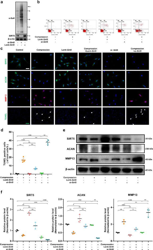 然后,研究人員假設(shè) SIRT5 在壓縮誘導(dǎo)的椎間盤退變中起保護作用,并在 NP 細胞中敲低或過表達Sirt5(圖1 a)。不出所料,與未處理組相比,si-Sirt5組的蛋白質(zhì)琥珀;矫黠@較高,lenti-Sirt5組的蛋白質(zhì)琥珀;斤@著較低(圖1 a),這進一步證實了SIRT5在NP細胞中有效的去琥珀酰酶活性。