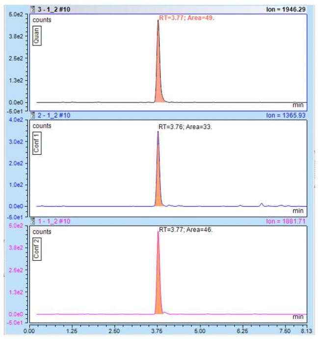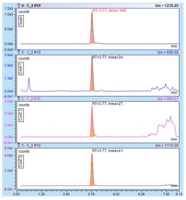 大多數(shù)多肽及核酸很難找到特征性的碎片離子,低能量下,沒有碎片離子生成,而高能量下又生成很多小的碎片離子;此時(shí)可以運(yùn)用SRM的母離子進(jìn)行定量或者SIM模式下抽提高響應(yīng)電荷態(tài)離子流來進(jìn)行定量。此時(shí)也同樣具備高的專屬性;多肽及核酸在進(jìn)行碎裂時(shí),往往會(huì)產(chǎn)生很多響應(yīng)很高但特異性不好的亞銨離子,這些離子會(huì)干擾SRM抽提離子通道的選擇,盡量不選擇低于200以下的,這些離子的通道的特異性差會(huì)有較高的背景干擾。