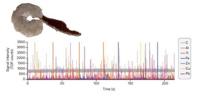 使用ICP飛行時間質譜儀(ICP-TOF-MS),可同時獲得每個單一實體瞬時事件的全元素質譜信號,從而確定單個顆粒、細胞的廣譜指紋。通過這種方式獲得納米塑料顆粒信息以及內摻金屬組分信息。另外,還可以采用高速激光剝蝕進樣系統(tǒng)搭配ICP-TOF-MS,通過某些微塑料顆粒的獨特金屬組分信息,來獲取微塑料顆粒在組織切片上的分布和濃度信息。