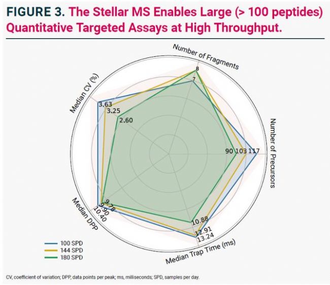 ■ 將P100檢測的通量提高到100 SPD、144 SPD和180 SPD,證明了Stellar 質(zhì)譜儀在高檢測通量下仍保持一致的定量性能。