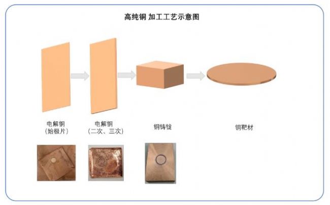 高純金屬(2N+ ~ 3N+)需要將原料依次提純加工,最終才能得到可供應(yīng)半導(dǎo)體行業(yè)的高純金屬靶材(4N5+ ~ 6N5+)。