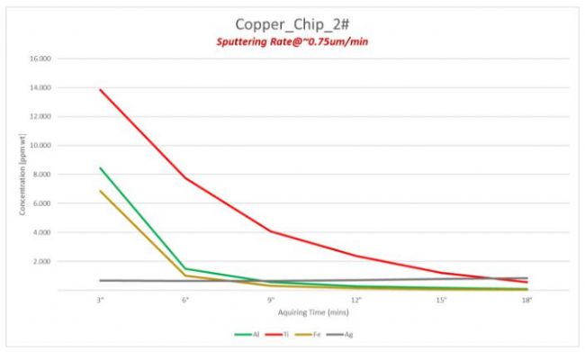 為了能夠體現(xiàn)出在不同的工藝參數(shù)及配比下,Chip_1#與Chip_2#的樣品表面的雜質(zhì)元素的縱向分布情況 (如圖所示)。僅采用10 sec脈沖源預(yù)濺射(Pre-Sputtering),測試時間~18mins/sample,預(yù)計濺射深度~13.5 μm。