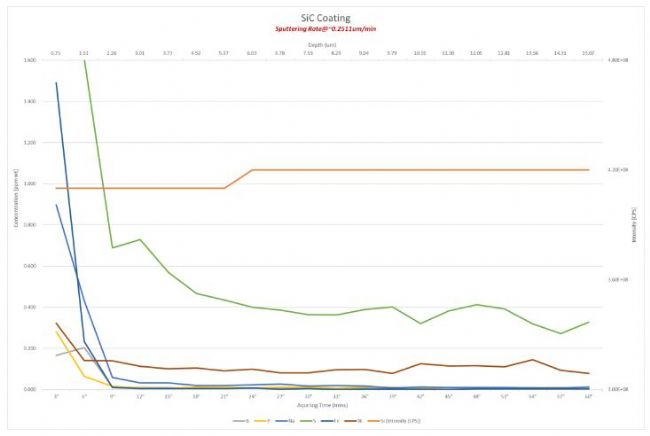 為了分析評估器件樣品表面SiC涂層(X00 μm)的關(guān)鍵痕量元素的縱向分布情況(如下圖所示),使用Element GD Plus GD-MS的