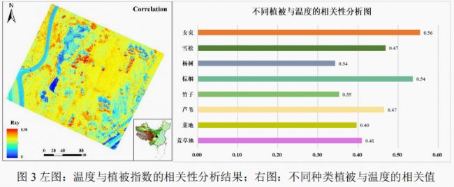 為了進(jìn)一步了解植被生長(zhǎng)對(duì)溫度的響應(yīng)情況,計(jì)算紅外熱成像結(jié)果與植被指數(shù)的相關(guān)性,結(jié)果顯示女貞樹(shù)與溫度的相關(guān)性最高,其次是棕櫚樹(shù),楊樹(shù)與竹子與溫度的相關(guān)性則較低。