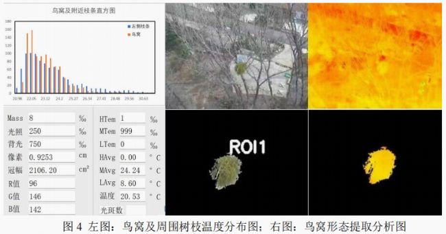 利用Thermo-RGB軟件對(duì)紅外熱數(shù)據(jù)與RGB數(shù)據(jù)進(jìn)行融合分析,可有效提取出動(dòng)物痕跡:例如鳥(niǎo)窩,同時(shí)可獲取鳥(niǎo)窩、周圍樹(shù)枝及其他物體的溫度及占地面積。