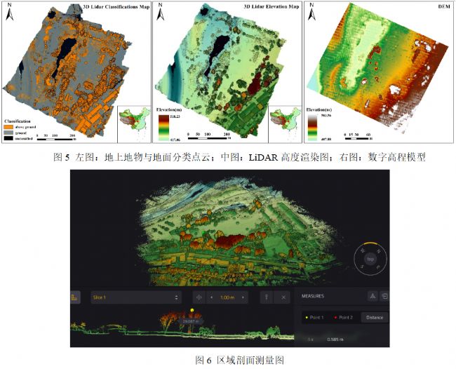 根據(jù)LiDAR數(shù)據(jù)可以將地物與地面進(jìn)行相對(duì)精確的分離;通過(guò)高度渲染圖發(fā)現(xiàn)研究區(qū)域整體上呈現(xiàn)西北低、東南高的地勢(shì)分布。通過(guò)分析點(diǎn)云剖面圖還可以精準(zhǔn)了解地物高度。