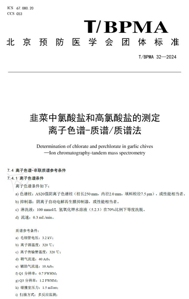 非常能夠理解發(fā)出這樣的疑問(wèn),畢竟離子色譜串聯(lián)質(zhì)譜的應(yīng)用普遍性遠(yuǎn)比不上液相色譜串接質(zhì)譜,更別說(shuō)標(biāo)準(zhǔn)了。不過(guò)這是真的,據(jù)查這是食品安全領(lǐng)域迄今第一個(gè)離子色譜串聯(lián)質(zhì)譜標(biāo)準(zhǔn),所以雖然是一個(gè)團(tuán)體標(biāo)準(zhǔn),但不妨礙其里程碑的意義,為推動(dòng)后續(xù)更多離子色譜質(zhì)譜標(biāo)準(zhǔn)的發(fā)布具有很好的指引和示范意義,為很多分析工作者提供了參考依據(jù)。該團(tuán)標(biāo)