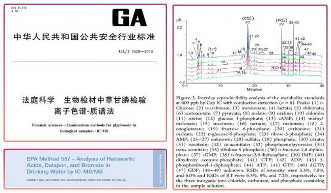 其實(shí),雖然國(guó)內(nèi)相關(guān)的標(biāo)準(zhǔn)幾寥寥無(wú)幾,但也不是完全沒(méi)有。早在2019年,公安部就發(fā)布過(guò)一個(gè)行業(yè)標(biāo)準(zhǔn),是用離子色譜串聯(lián)質(zhì)譜檢測(cè)生物檢材中的草甘膦。近幾年在食品安全和環(huán)境領(lǐng)域,離子色譜串聯(lián)質(zhì)譜的標(biāo)準(zhǔn)也有正在進(jìn)行中的。在國(guó)外,離子色譜串聯(lián)質(zhì)譜技術(shù)則更早被應(yīng)用到一些標(biāo)準(zhǔn)方法里,特別是EPA標(biāo)準(zhǔn)方法,F(xiàn)DA也有一個(gè)用離子色譜串聯(lián)質(zhì)譜檢測(cè)檢測(cè)高氯酸鹽的標(biāo)準(zhǔn)方法。查閱文獻(xiàn),不難發(fā)現(xiàn),關(guān)于離子色譜質(zhì)譜的文章是很多的,甚至是十多年前這項(xiàng)先進(jìn)的技術(shù)就已經(jīng)用于解決疑難問(wèn)題了,主要集中在食品安全和環(huán)境領(lǐng)域強(qiáng)極性農(nóng)殘、鹵乙酸類和高氯酸鹽分析,以及核苷酸、糖、有機(jī)酸等代謝物分析。