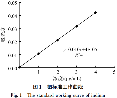 分別移取B標(biāo)準(zhǔn)液0mL,1mL,2mL,3mL,4mL于100mL容量瓶中,加5mL硝酸,用水稀釋至刻度,搖勻。此溶液濃度分別為0μg/mL,1μg/mL,2μg/mL,3μg/mL,4μg/mL。在與試樣相同的測定條件下測定系列標(biāo)準(zhǔn)的吸光度,以銦濃度為橫坐標(biāo),吸光度為縱坐標(biāo),繪制工作曲線。其工作曲線如圖1所示。