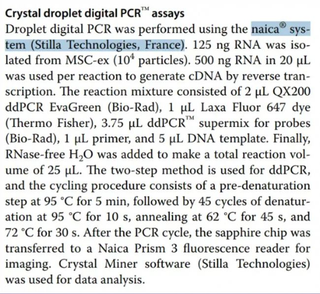 使用naica微滴芯片數(shù)字PCR系統(tǒng)精準(zhǔn)定量MSC-ex中的miRNA,為外泌體中的微量miRNA功能研究提供了定量分析手段。