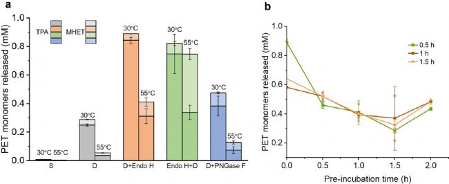 設(shè)定不同的Endo H實驗條件,觀察處理后的Is PETase-Pp催化活性,結(jié)果如Fig. 3a?梢钥闯,發(fā)酵上清液幾乎沒有任何活性,因為培養(yǎng)基中的金屬離子,尤其是Fe3+會顯著抑制酶的催化活性。用10 kDa超濾膜過濾上清液后,酶活性明顯提高。并且無論是超濾前還是超濾后用Endo H處理樣品,酶活性均顯著提高。此外,用PNGase F酶切除完整N糖鏈后的酶活性有所提高,但比Endo H處理后的活性低一些。然后,作者探索了Endo H的處理時間,結(jié)果表明用667 nM Endo H處理0.5 h后可以保持較高的初始活性(Fig. 3b)。