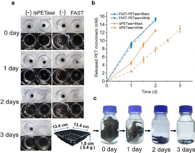 隨機購買白色和黑色PET托盤制品各一份,使用重組IsPETase和Fast-PETase分別進行降解測試。部分脫糖IsPETase-Pp在2天內(nèi)降解了黑色托盤薄片(圖 6a)。HPLC結(jié)果顯示PET幾乎以線性速度被降解(Fig. 6b)。而部分脫糖Fast-PETase-Pp的降解速度更快,在2d內(nèi),補酶一次可使PET薄片完全降解。此外,部分脫糖Fast-PETase-Pp在50°C下,3天內(nèi)即可完全降解5.4 g黑色PET托盤(Fig. 6c)。但對PET水瓶的降解能力不明顯。