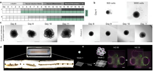 為了量化類器官之間的形態(tài)動態(tài)變化,作者利Viventis LS2光片顯微鏡低光毒性、多位點(diǎn)、多視角的成像能力,一次成像并行記錄16個類器官通過統(tǒng)計(jì)分析不同時間點(diǎn)類器官體積、腔室體積和腔室數(shù)量,結(jié)果突出了早期大腦類器官發(fā)育的三個形態(tài)動力學(xué)階段,包括: