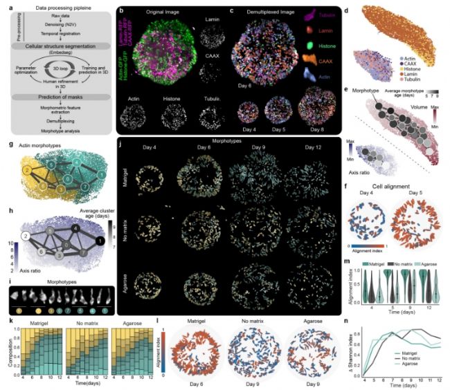研究人員利用多位點(diǎn)標(biāo)記的質(zhì)膜、肌動蛋白、微管、核膜和組蛋白評估細(xì)胞形態(tài)變化在早期大腦類器官發(fā)育過程中對細(xì)胞的影響。通過開發(fā)的圖像分析流程:圖像預(yù)處理→亞細(xì)胞結(jié)構(gòu)分割→結(jié)構(gòu)預(yù)測→特征提取→解多通道→形態(tài)特征分析,揭示了兩個主要的核(組蛋白、層粘連蛋白)和細(xì)胞(肌動蛋白、微管、膜)結(jié)構(gòu)組。