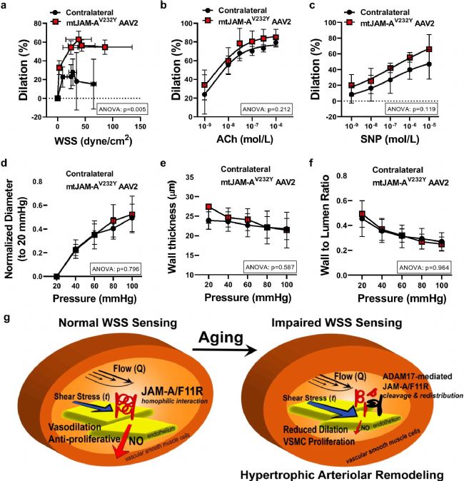 最后,確定了與衰老相關的 WSS 機械感知損傷和異常動脈重塑是否可以逆轉。在受限動脈內(nèi)遞送編碼ADAM17抗切割突變小鼠JAM-A/F11R的AAV2QuadYF載體2周后,發(fā)現(xiàn)目標骨骼肌阻力動脈段表現(xiàn)出明顯增強的WSS誘導的擴張,而內(nèi)皮依賴性激動劑ACh- 和直接NO供體SNP- 誘導的反應與老年小鼠的對側動脈相似(圖3 a-c)。然而,與老年小鼠對側動脈相比,mtJAM-AV232Y過表達動脈段的動脈壁厚度、壁-管腔壓力關系以及動脈內(nèi)管腔直徑-壓力關系均無明顯變化(圖3 d-f)。這些數(shù)據(jù)表明,在體內(nèi),過表達ADAM17抗切割突變小鼠JAM-AV232Y可改善WSS反應,但不能逆轉老年小鼠的異常重塑。